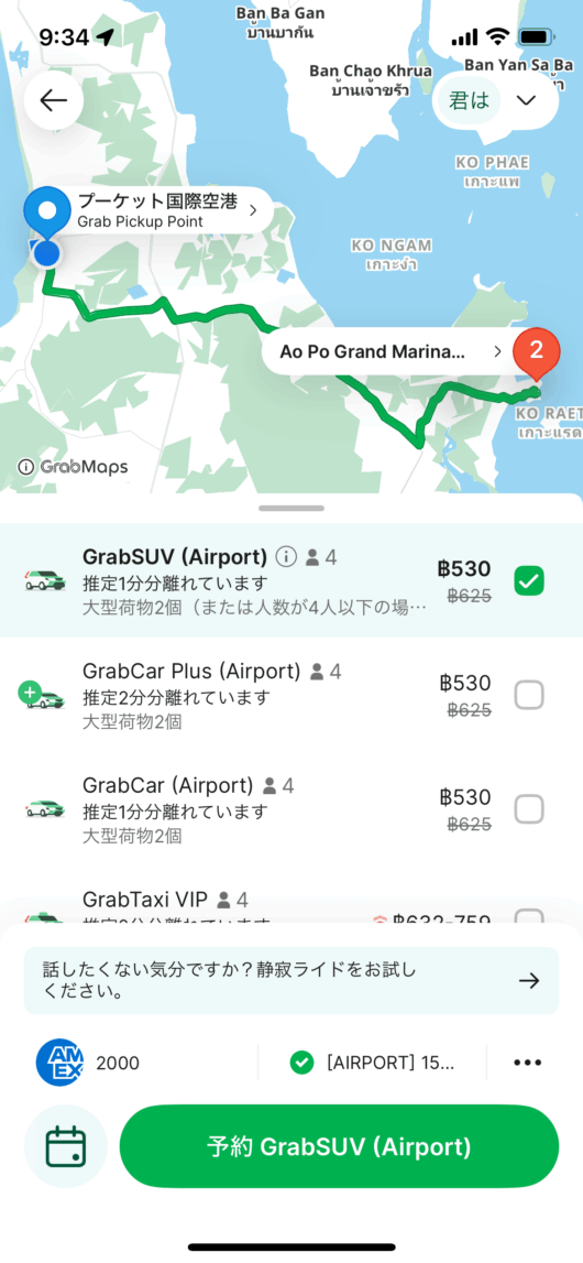空港の呼び込みのタクシーは最初900バーツと言われ、Grabで調べた画面を見せたら700バーツまで下がりました。とはいえ、できるだけキャッシュではなくクレジットカードで支払える方が良かったのでGrabで。